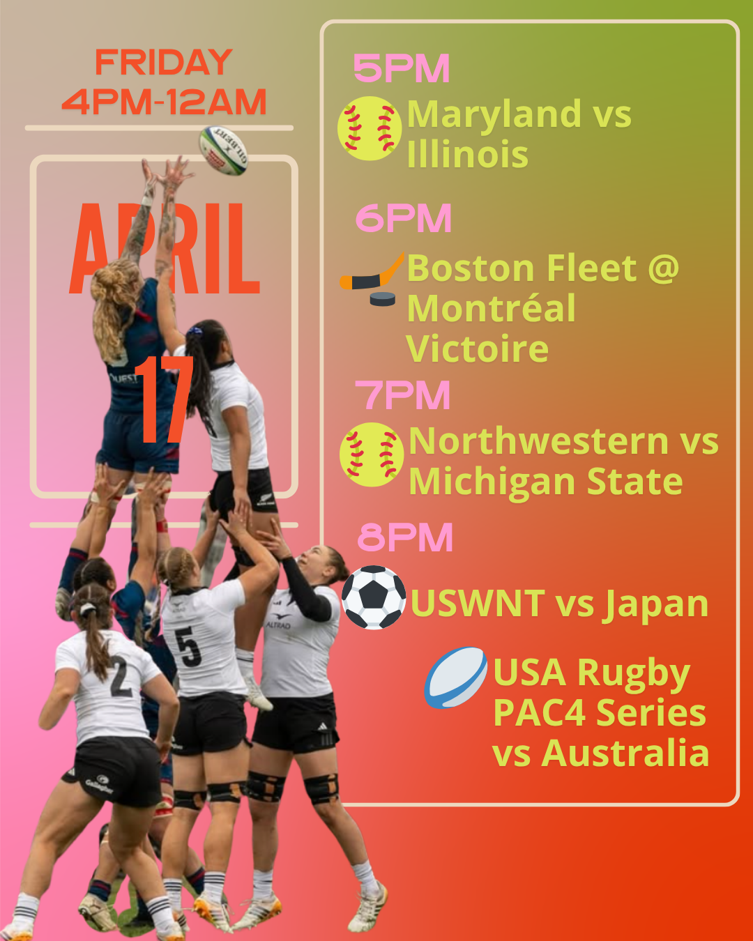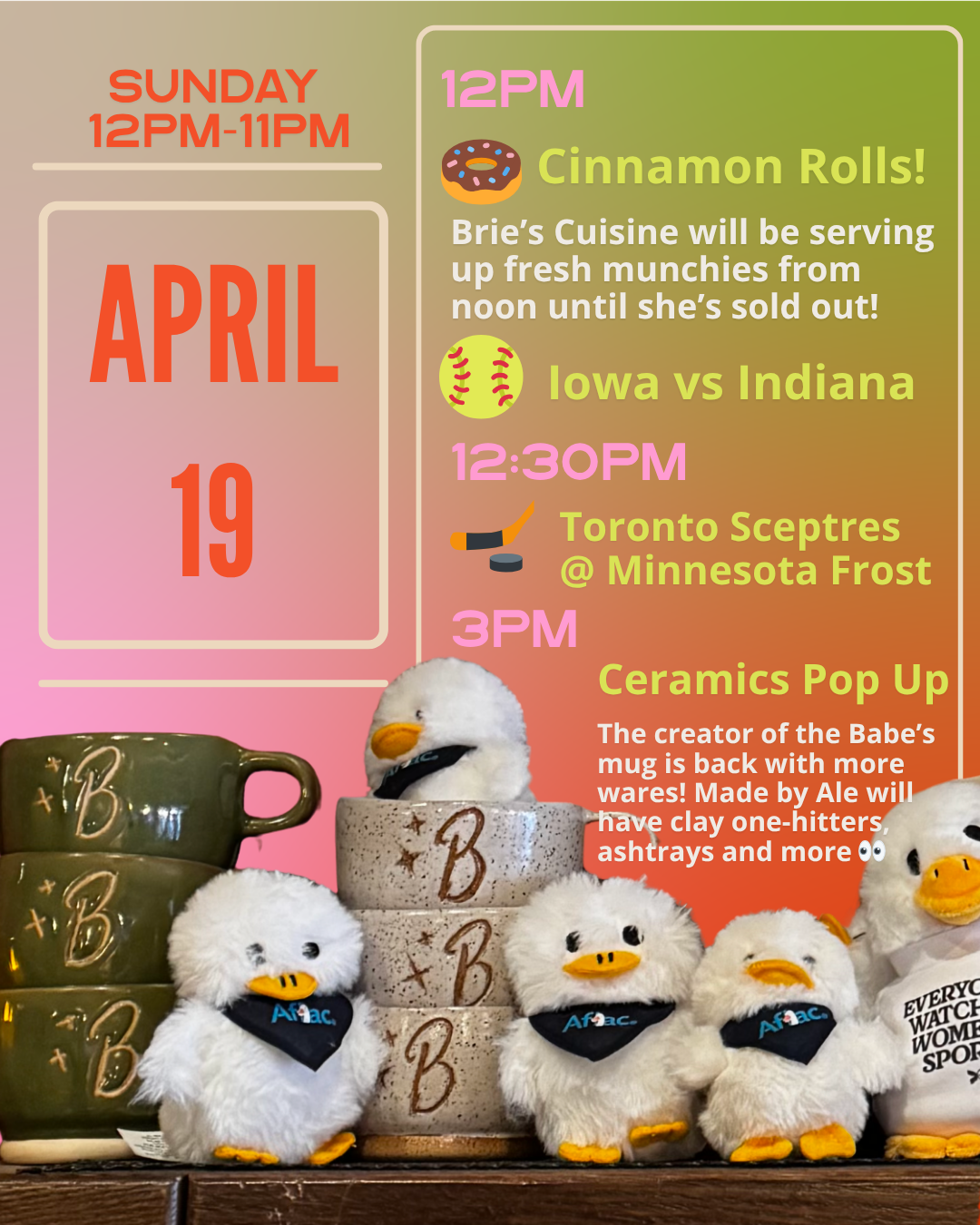 lots of cute things coming up this week! there are 2 USWNT international friendlies to watch, with a special meetup for RE—INC members (and anyone who wants to join!) on Thursday to watch The RE—CAP Show. on Friday we can cheer on USA Rugby as they take on Australia - this is your chance to learn the rules before the IRL game at SeatGeek on April 24th! and Sunday we’ll have a delish cinnamon rolls pop up from Brie’s Cuisine and Made by Ale will be back for an encore after they sold everything at Soup Night with some 4/20 friendly ceramic accessories for sale. see you at Babe’s!!! 💕