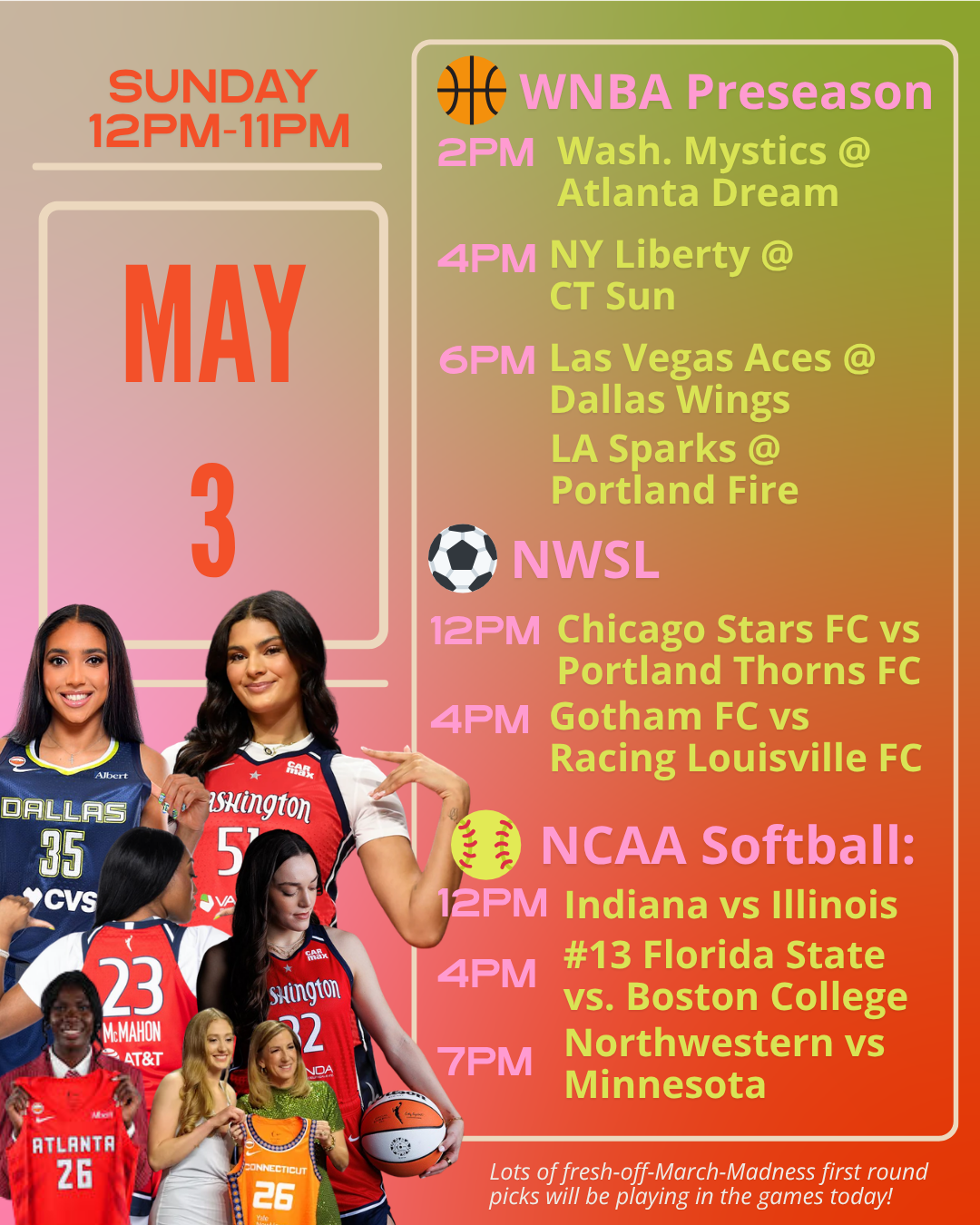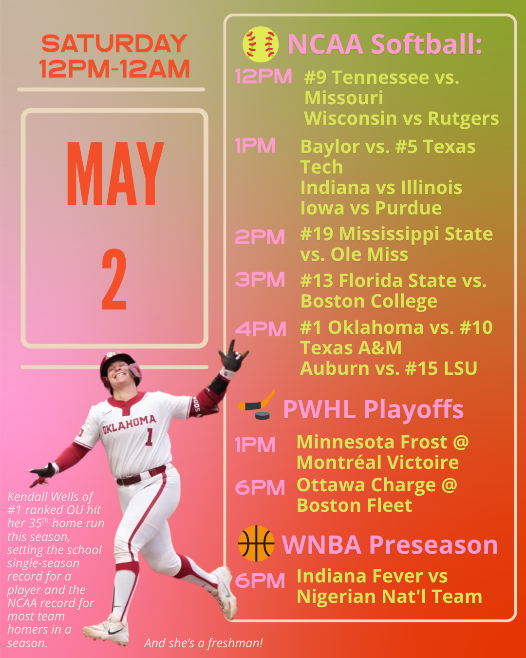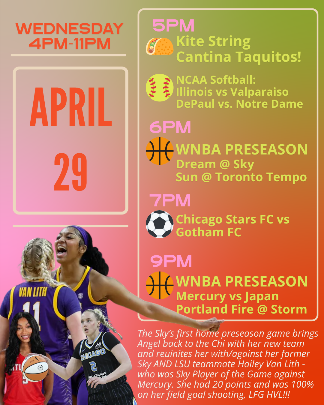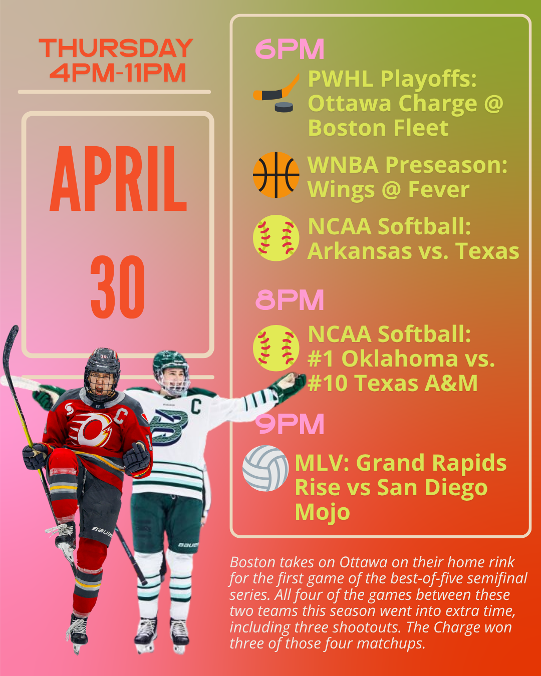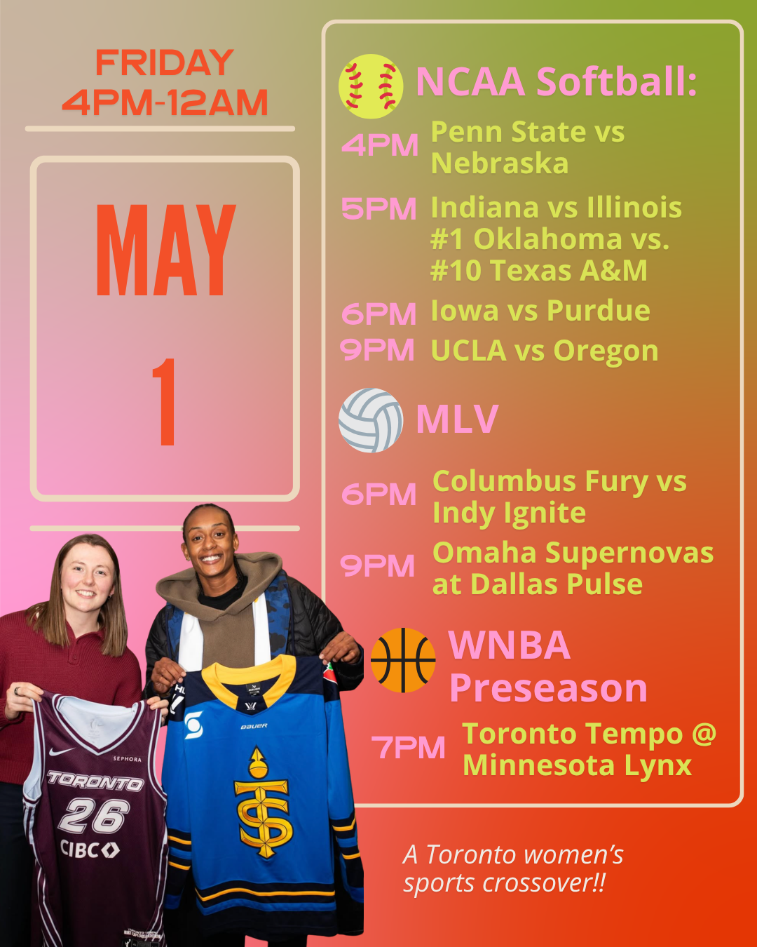 We have so many sports on deck this week! The PWHL is in playoffs, college softball is gearing up for the World Series in May, the WNBA preseason is underway, plus regular season games for NWSL and Major League Volleyball. Come get your women’s sports fix at Babe’s!